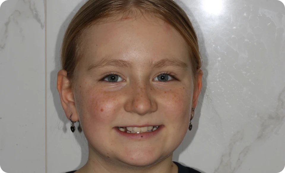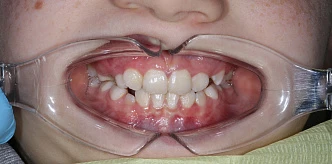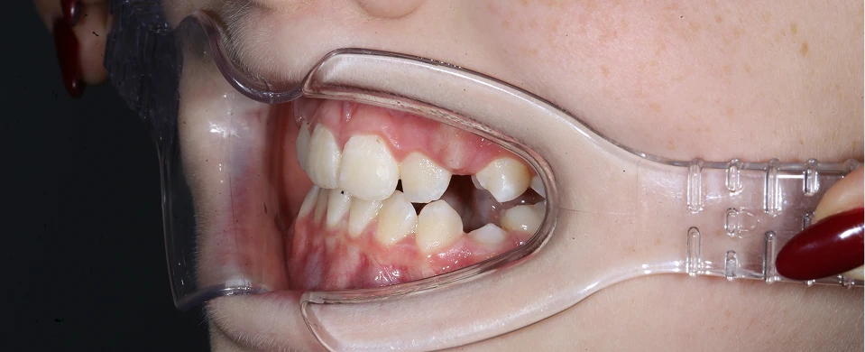 На верхней челюсти зафиксирован аппарат Хаас. Создано место для клыков, проведена подготовка к постоянному прикусу. Междисциплинарное лечение: хирургия и логопедия