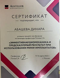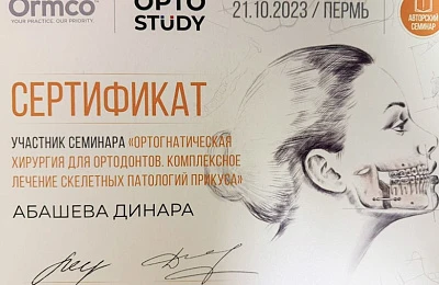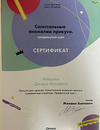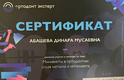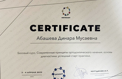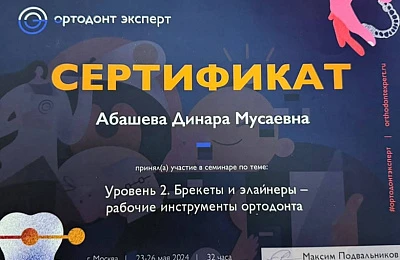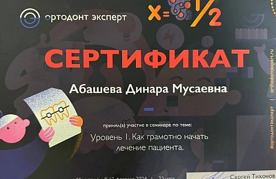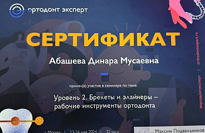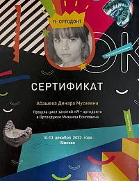Абашева Динара Мусаевна -врач ортодонт ,занимающийся коррекцией неровного положения зубов и лечением неправильного прикуса преимущественно подростков и взрослых ,ежегодно совершенствуя свои навыки ,посещая множество семинаров и мастер -классов у топовых ортодонтов Москвы и Санкт-Петербурга.