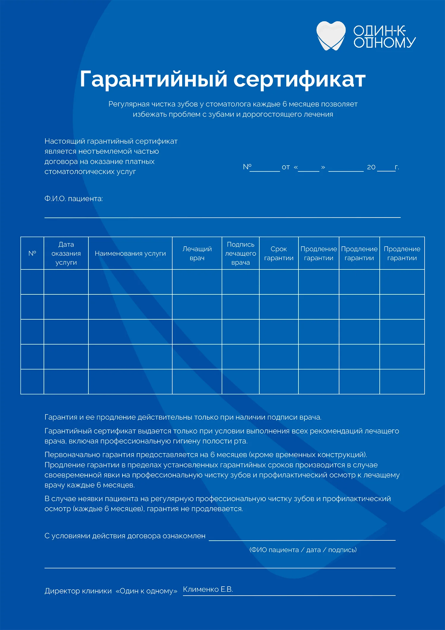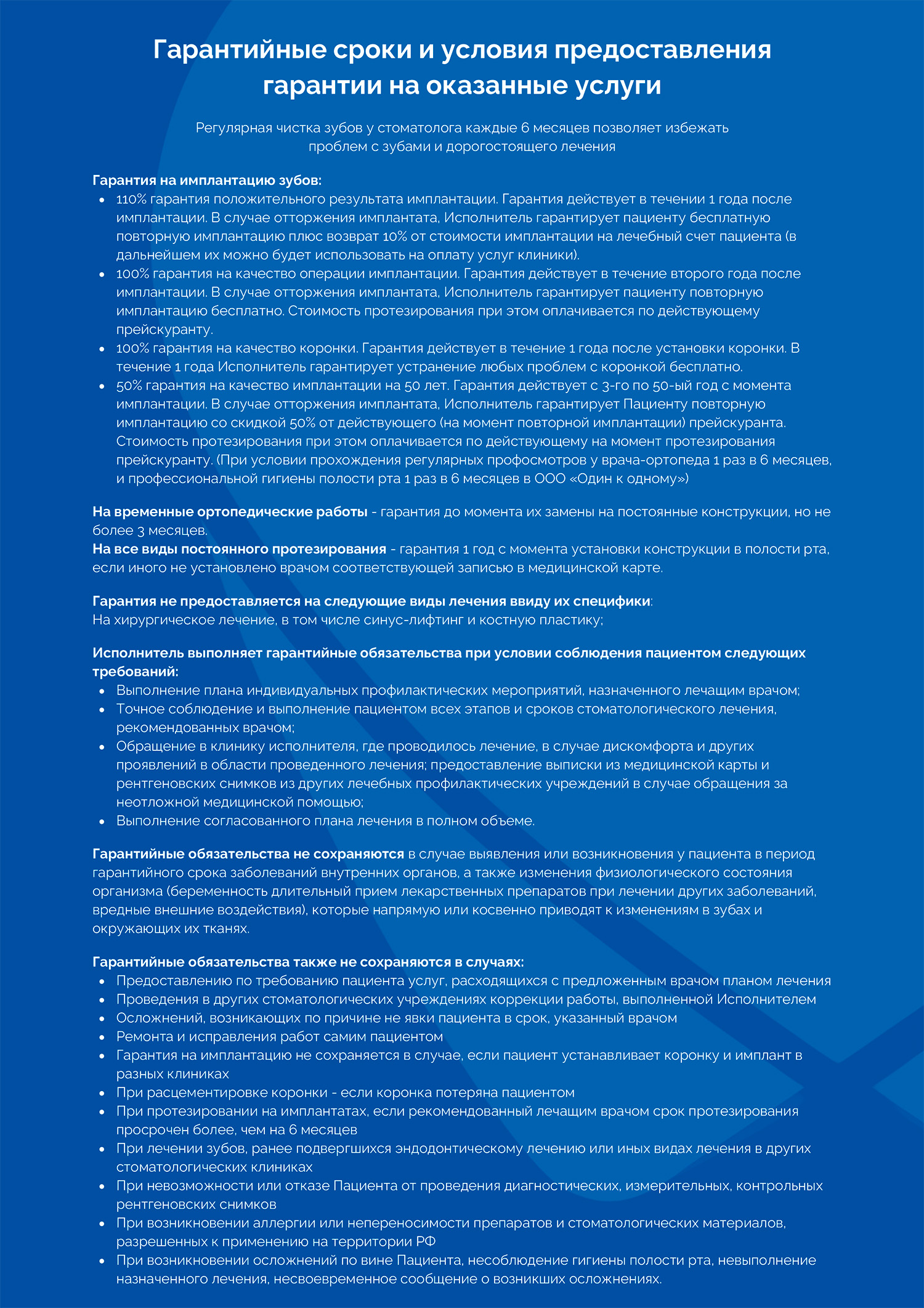 1. Общие положения Настоящее Положение разработано в целях урегулирования взаимоотношений, возникающих между Клиникой и пациентом (далее—Заказчиком). При оказании стоматологической помощи и выполнении гарантийных обязательств. Клиника строго руководствуется: Федеральный закон "Об основах охраны здоровья граждан в Российской Федерации" от 21.11.2011 N 323-ФЗ и Закон РФ от 07.02.1992 N 2300-1«О защите прав потребителей». Настоящее положение определяет гарантийные сроки на производимые в Клинике стоматологические услуги, работы, правила их установления и изменения. Все работы и услуги выполняются на основании лицензии, в соответствии с существующими технологиями, все материалы сертифицированы, зуботехнические работы изготавливаются в лицензированной лаборатории. Все материалы разрешены для применения на территории Российской Федерации. 2. Определение понятий гарантий Гарантийный срок — это период времени, в течение которого в случае обнаружения недостатка в выполненной работе (оказанной услуге), пациент вправе потребовать безвозмездного (бесплатного) устранения выявленных недостатков. В период гарантийного срока Клиника обязуется устранить недостатки за свой счет, если не докажет, что данный случай не является гарантийным и неблагоприятные последствия связаны с обстоятельствами, возникшими после принятия работы Заказчиком вследствие нарушения им правил использования результата услуги, действий третьих лиц, непреодолимой силы, иных обстоятельств, предусмотренных настоящим Положением. Гарантийный срок исчисляется с момента передачи результата работы пациенту, то есть с момента оказания услуги. Конкретный гарантийный срок на оказанную услугу устанавливается лечащим врачом и указывается в медицинской документации с учетом обстоятельств установления гарантии. Недостаток - это несоответствие оказанной стоматологической услуги обязательным медицинским требованиям (стандартам), технологиям и условиям договора. Обстоятельства установления гарантий - это ряд объективных факторов, заявленных пациентом и выявленных врачом в конкретной клинической ситуации, которые могут оказать влияние на результат лечения определенным образом - позитивно, нейтрально или негативно: