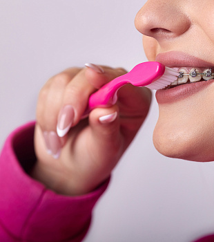 Чистить зубы нужно после каждого приема пищи. Помимо обычной щетки стоит использовать ортодонтическую с V-образным вырезом, монопучковую щетку, ершики и флосс. Ирригатор помогает очищать труднодоступные зоны.
